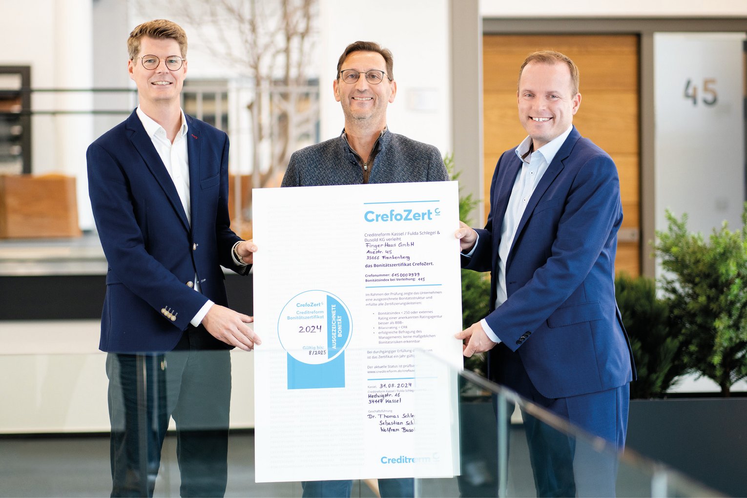 Bereits zum zwölften Mal in Folge hat die Creditreform Rating AG den Frankenberger Fertighaushersteller FingerHaus mit dem Bonitätszertifikat "CrefoZert" ausgezeichnet. Erneut erhält unsere Schwesterfirma FingerHaus dabei das Zertifikat in der höchsten Bonitätsstufe und wird mit dem Prädikat „Ausgezeichnete Bonität“ prämiert. Gerade in Zeiten, in denen Unternehmensinsolvenzen in der Baubranche angehende Bauherren verunsichern, ist die Auszeichnung ein wichtiges Signal für die finanzielle Stabilität und die damit einhergehende Verlässlichkeit des Baupartners.